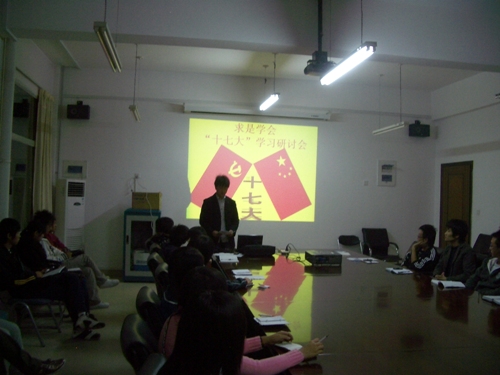 10月18日,我院团委求是学会在行政楼302室召开关于“十七大”政策方针的学习研讨会。求是学会主席团成员及社团部分代表参与了此次研讨会。