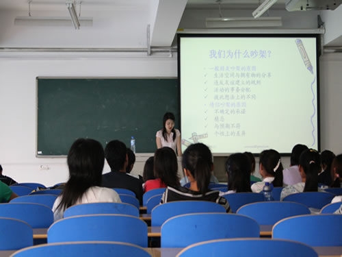 夏老师用生动有趣的图片分析了人与人之间的合作与竞争、包容与对抗等的关系,从同学们熟悉的宿舍相处的情境总分析了冲突产生的原因以及冲突的破坏性和建设性,并就情绪控制等问题给予了具体指导。在座同学纷纷表示受益颇多。