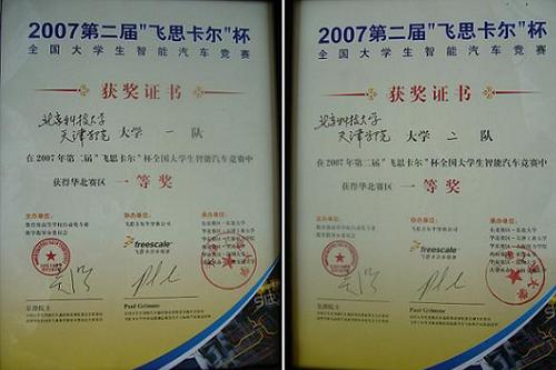 我院在此次比赛中共派出两支参赛队伍,分别为北京科技大学天津学院一队与北京科技大学天津学院二队。经过两天的比赛,我院二队与一队分别以华北赛区第9名与第10名的成绩晋级全国总决赛,并荣获2007年第二届“飞思卡尔”杯全国大学生智能汽车竞赛华北赛区一等奖。