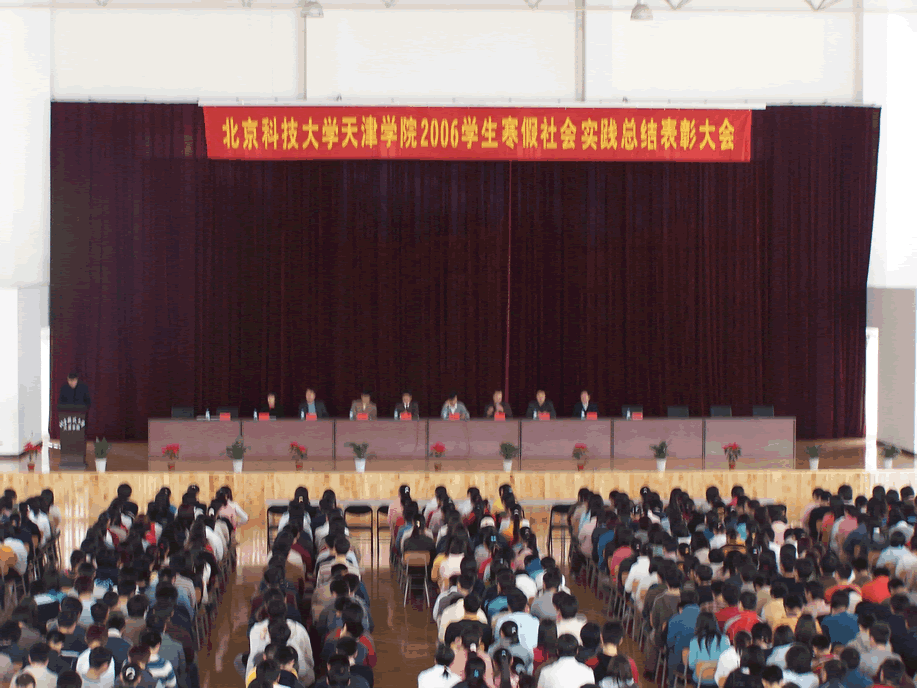4月4日下午,北京科技大学天津学院2006学生寒假社会实践总结表彰大会在体育馆隆重举行,我院常务副院长郭景文、副院长梁云东、副院长王斌、财务总监张军、综合办公室主任李帅、体育部主任吴铁桥、教育技术中心主任许学东、学生事务部主任盛佳伟、副主任张卫、教学事务部副主任吴平、各专业辅导员及全体学生参加了表彰大会,院领导为获奖同学颁发了荣誉证书,并鼓励同学们再接再厉,在社会实践中锻炼自己。
