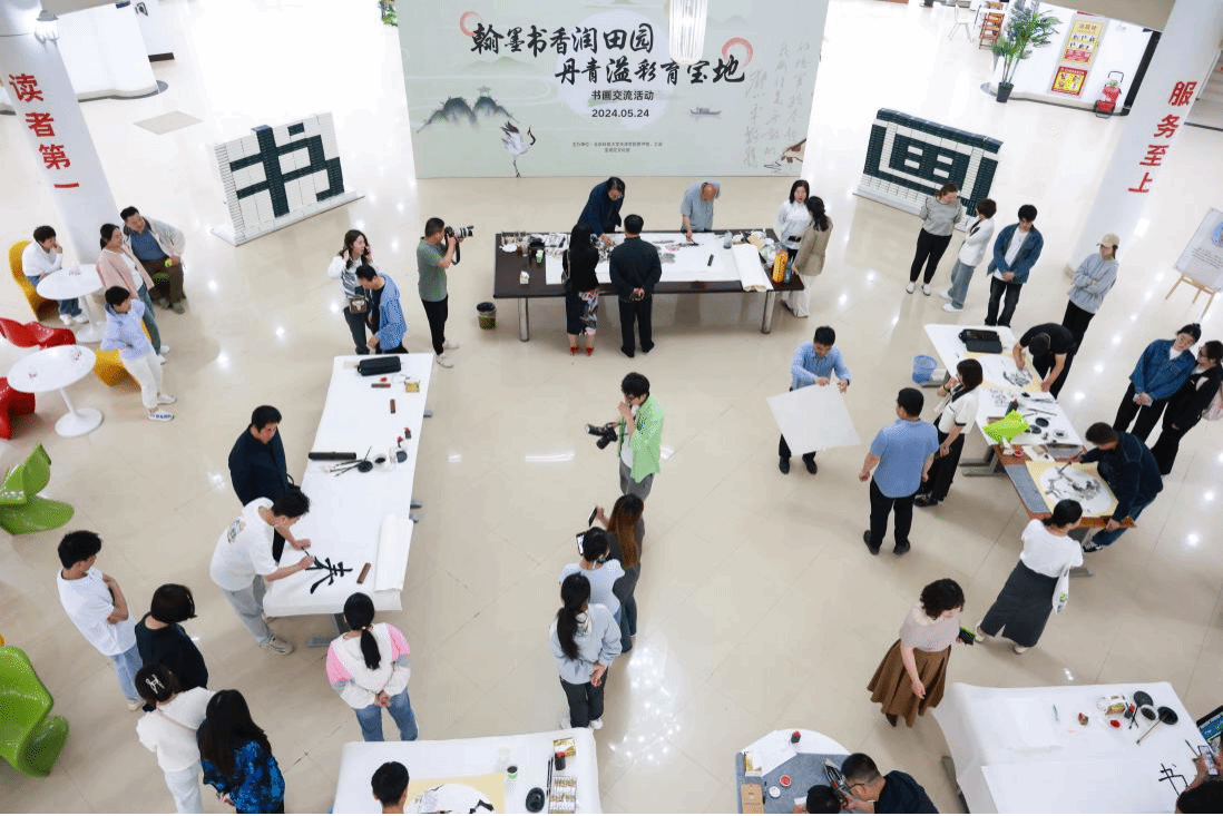 为了弘扬中华优秀传统文化,营造热爱国粹、热爱书画艺术的氛围,更好地推动校园文化建设,图书馆联合学院工会、宝坻区文化馆于5月24日下午在社科馆举办“翰墨书香润田园 丹青溢彩育宝地”书画交流活动。宝坻区文化和旅游局副局长张英、北京科技大学天津学院副院长兼财务总监王俊敏、北京科技大学天津学院党委副书记、工会主席郭雅娟、宝坻区文化馆馆长倪芳芳、宝坻区的书画家、文化馆工作人员、图书馆全体馆员以及学院书画爱好者200余人参加了活动。