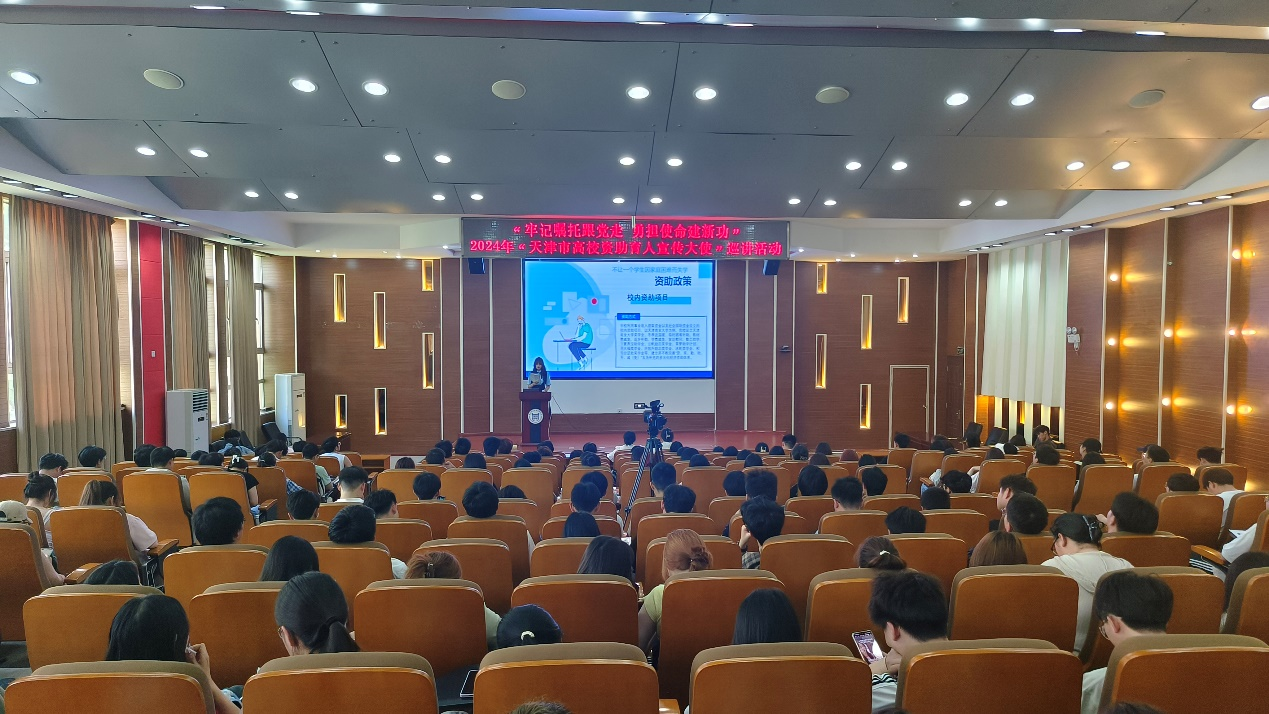 为深入贯彻习近平新时代中国特色社会主义思想和党的二十大精神,进一步落实国家资助政策,推进国家资助政策宣传的广度和深度,扩大学生资助政策宣传效果,充分发挥受助学生典型的示范引领作用,根据《市教委关于进一步加强新时代学生资助工作的通知》(津教政〔2021〕3 号)的相关精神,2024年5月8日下午,我院邀请天津商业大学资助政策宣传人王可心到校开展巡讲活动。学习与发展指导中心赵怡老师、李贝贝老师及学生代表共计200余人参加活动。